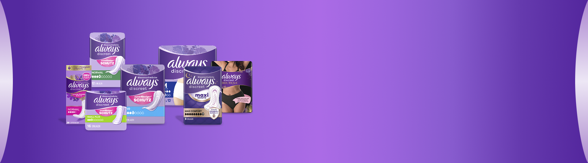 Always Discreet steht für eine Reihe von Slipeinlagen, Einlagen und Höschen, die speziell für Frauen mit Blasenschwäche entwickelt wurden. Alle Inkontinenzprodukte bieten zuverlässigen Schutz mit einem super saugfähigem Kern, der Flüssigkeiten und Gerüche in Gel umwandelt. Besser noch, sie geben Ihnen Diskretion, damit Sie ihr Leben in vollen Zügen genießen können.