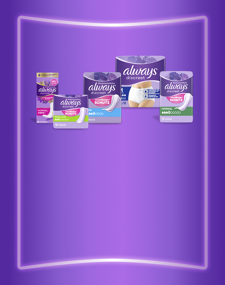 Welche Einlage verwendet man bei Blasenschwäche und welche bei der Periode? Das ist eine häufig gestellte Frage. Wir möchten Ihnen dabei helfen, das für Sie passende Damenhygieneprodukt zu wählen. Wir wissen, dass es verwirrend sein kann. Viele Frauen, die unter einer Blasenschwäche leiden, sind sich gar nicht bewusst, dass sie das falsche Produkt für ihre Inkontinenz verwenden. Das wollen wir ändern. Inkontinenzeinlagen sind besonders saugfähige Einlagen, die zum Schutz vor Auslaufen der Blase entwickelt wurden. Sie verfügen über eine Technologie, die Uringeruch kontrolliert und die Haut schützt. Inkontinenz geht mit anderen Arten von Flüssigkeiten und Gerüchen einher als die Menstruation. Deshalb können die Inkontinenzeinlagen von Always Discreet besser mit ihnen umgehen als eine Damenbinde! Einlagen zur Blasenkontrolle gibt es in verschiedenen Größen und mit unterschiedlichen Saugfähigkeiten. Nutzen Sie unsere Auswahlhilfe für Inkontinenzprodukte, um die richtige Größe und Saugfähigkeit für sich zu finden. Damenbinden, auch bekannt als Periodenbinden oder Slipeinlagen, sind nicht dafür gedacht, Urin einzuschließen. Sie sollen den Blutfluss absorbieren und werden von Frauen in unterschiedlichen Situationen verwendet: beispielsweise während der Menstruation, bei Blutungen nach der Geburt oder nach einer Scheidenoperation. Ähnlich wie Inkontinenzeinlagen gibt es Menstruationseinlagen in verschiedenen Größen und mit unterschiedlichen Saugfähigkeiten, von leicht bis sehr saugfähig. Hier geben wir Ihnen einen Überblick über die wichtigsten Unterschiede zwischen Inkontinenzeinlagen und Damenbinden.